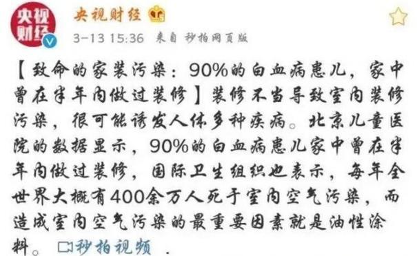 據央視報道,根據北京兒童醫院的數據顯示,90%的白血病患兒家中曾在半年內做過裝修。事實上,人們每天平均有2/3的時間在室內度過,室內環境污染對兒童、孕婦的損害更為嚴重。在房子裝修過程中,地面、墻面裝飾材料是最大污染源之一。